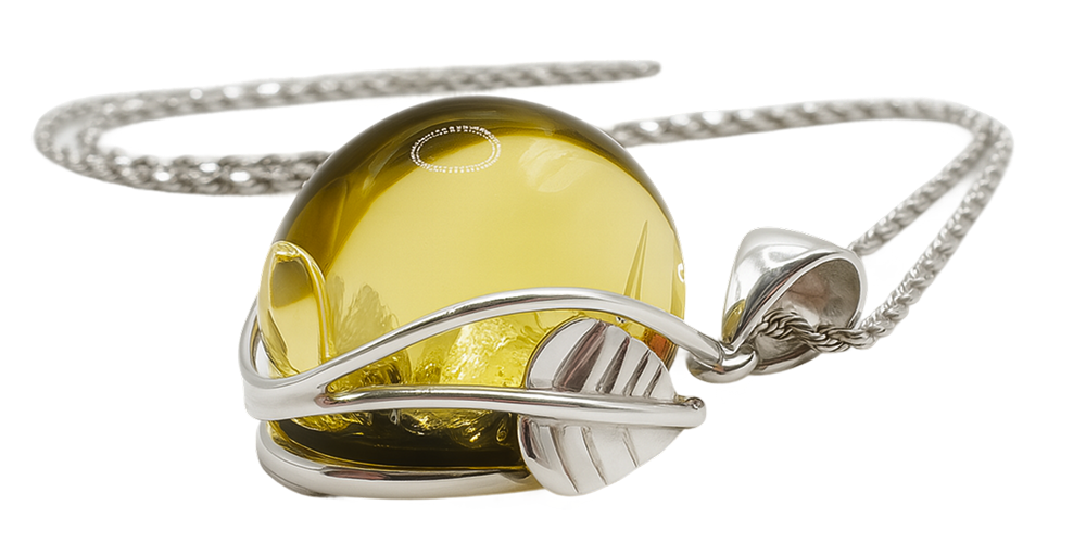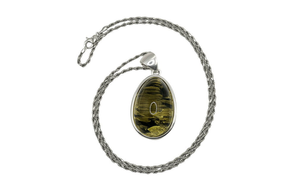 La peça d’ambre lluu amb una muntura de plata elegant, pensada per captivar totes les generacions.
