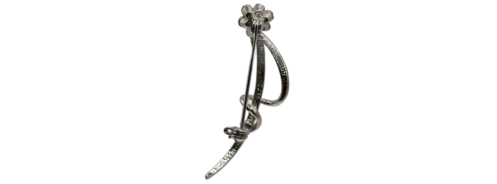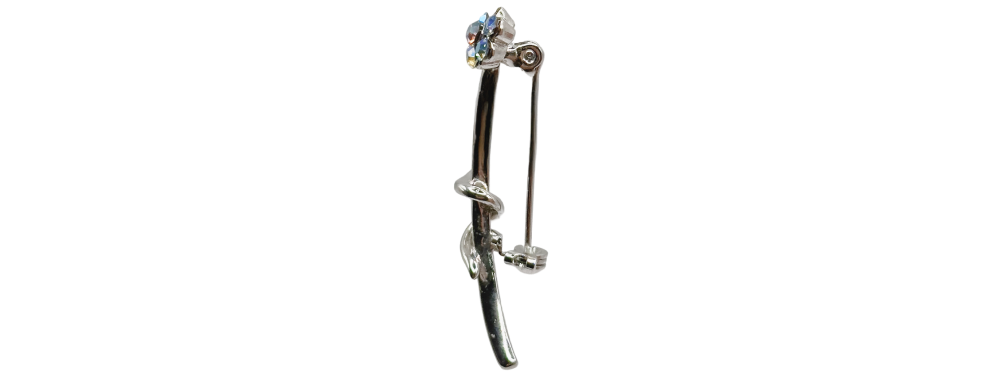 El broche está elaborado en metal pulido con acabado en plata y cristales tallados de alta calidad.