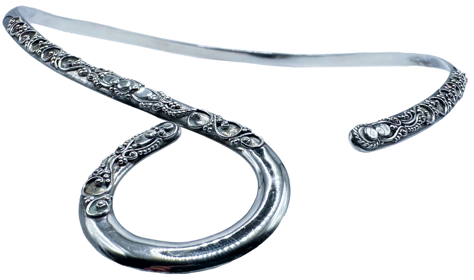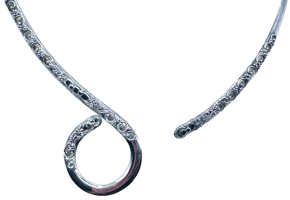 La elegancia atemporal de los collares mujer se traduce en este collar aro, trabajado artesanalmente en plata, que destaca por su acabado pulido y elaborados grabados.