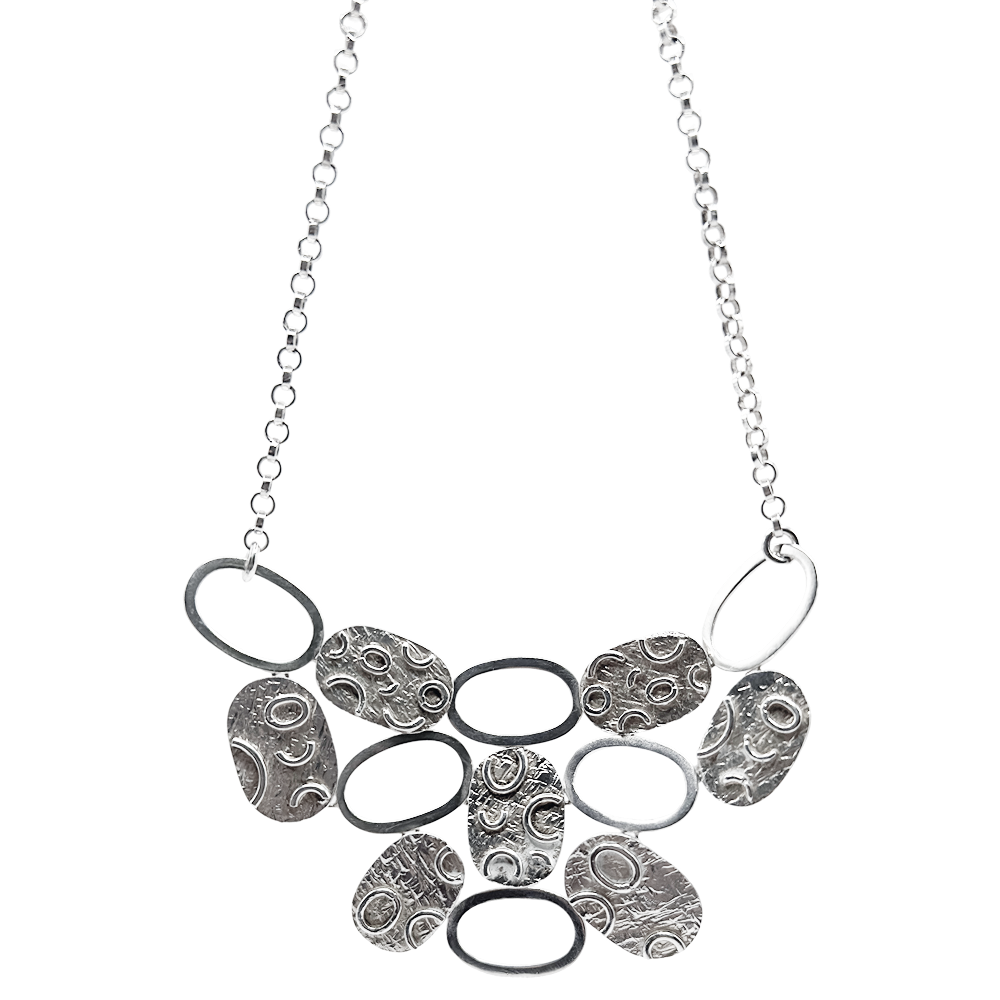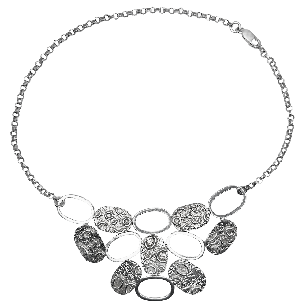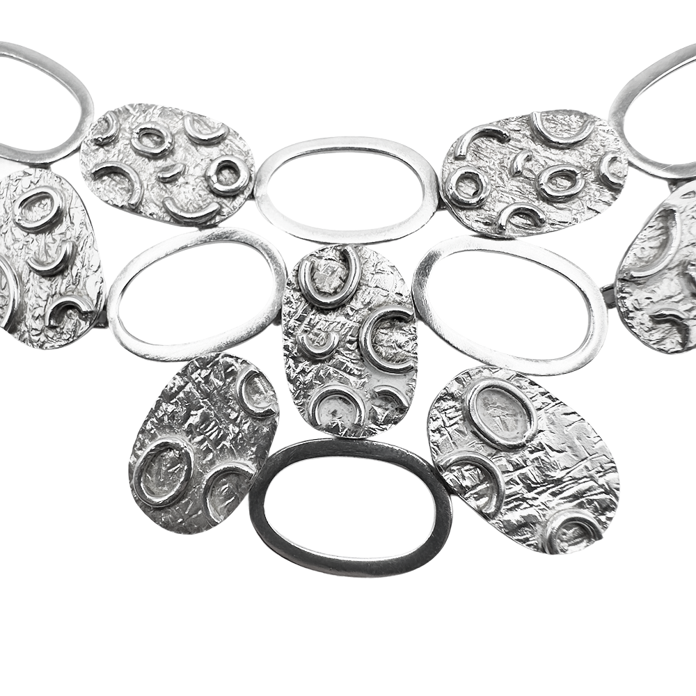 La textura grabada en los discos despliega arte en joyas de plata, ofreciendo complementos de lujo únicos para mujeres que buscan destacar.