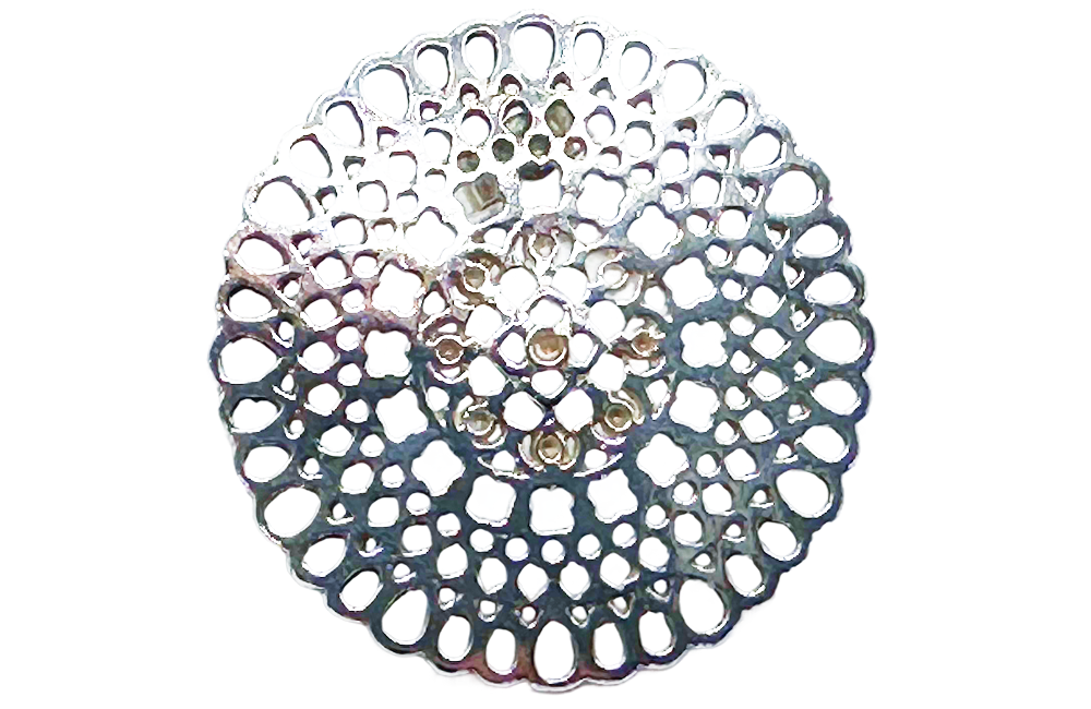 - Forma: Disco plano circular con un grabado calado distintivo y sofisticado.